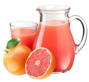 لیوان کامل و شیشه آب گریپ فروت و میوه در جلو