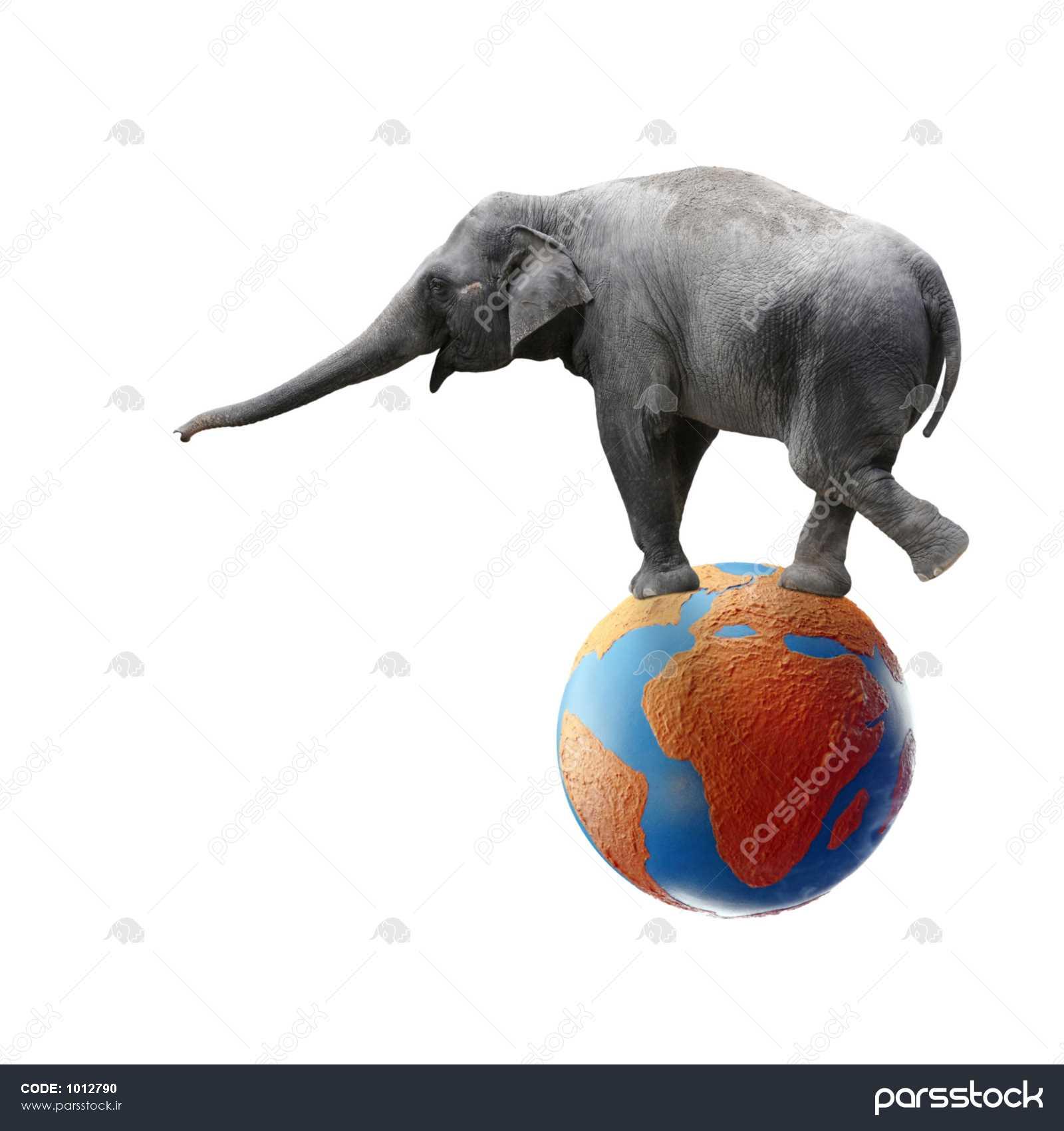 فیل خنده‌داری که خرطوم خود را دراز می‌کند در حالی که بر روی کره‌ای رنگارنگ که قاره آفریقا را جدا از سفیدی نشان می‌دهد تعادل برقرار می‌کند