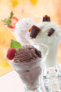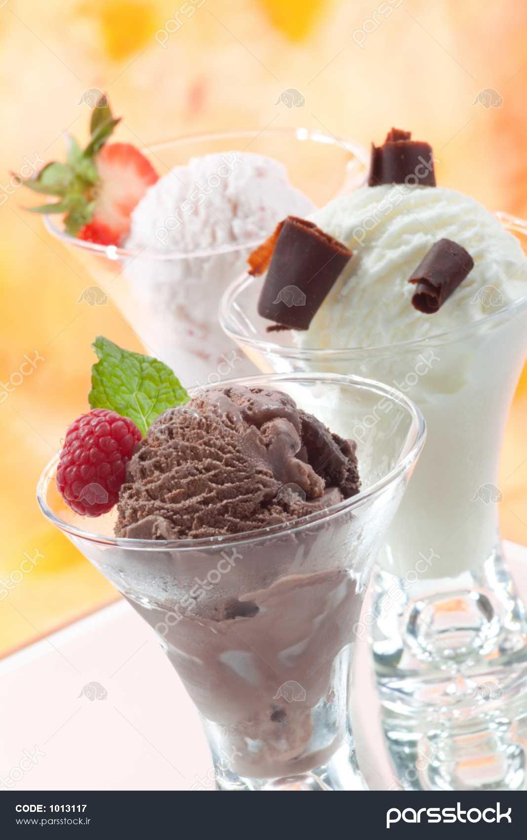 نمای نزدیک از بستنی خوشمزه وانیلی توت فرنگی و شکلاتی با انواع توت های تازه نعناع و شکلات