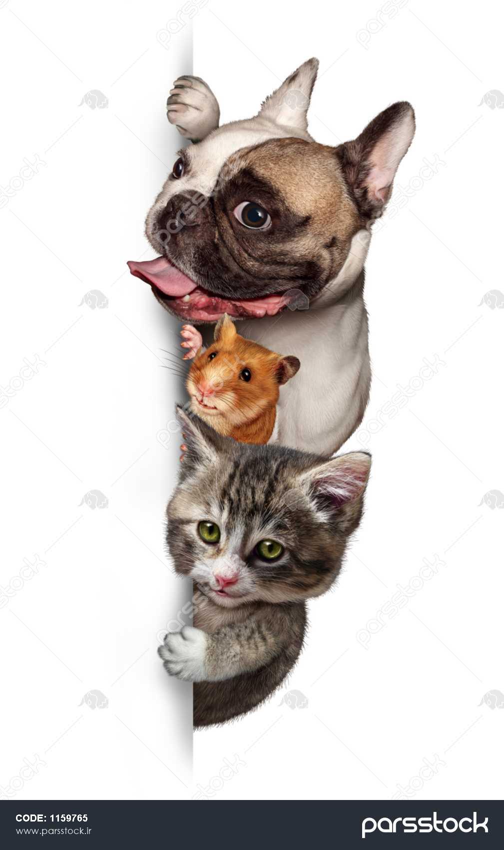 حیوانات خانگی تابلوی نمایش عمودی برای دامپزشکی و فروشگاه حیوانات خانگی یا پیام تبلیغاتی برای فرزندخواندگی حیوانات با یک همستر سگ ناز و یک گربه آویزان شده روی یک پلاکارد سفید سفید کپی sp