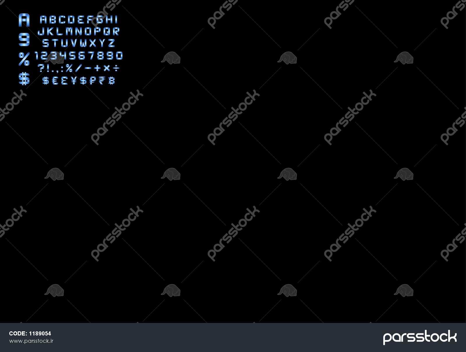 بسته الفبا اعداد ارز و نمادها - فونت فلزی آبی خمیده مستطیلی
