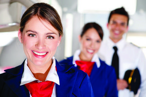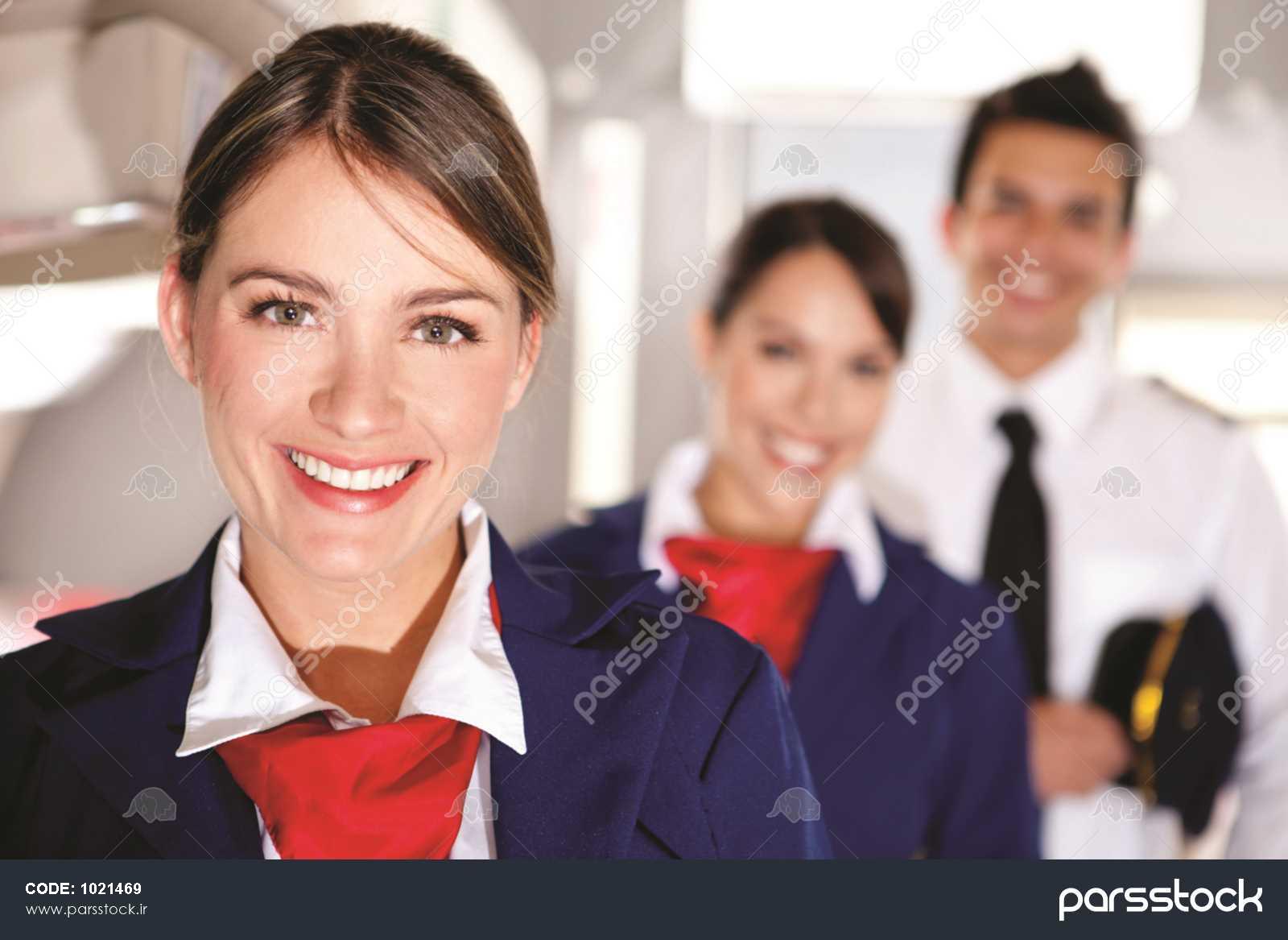 مهماندار هوایی با خدمه کابین هواپیما در حال لبخند زدن