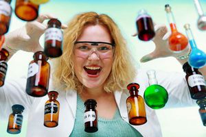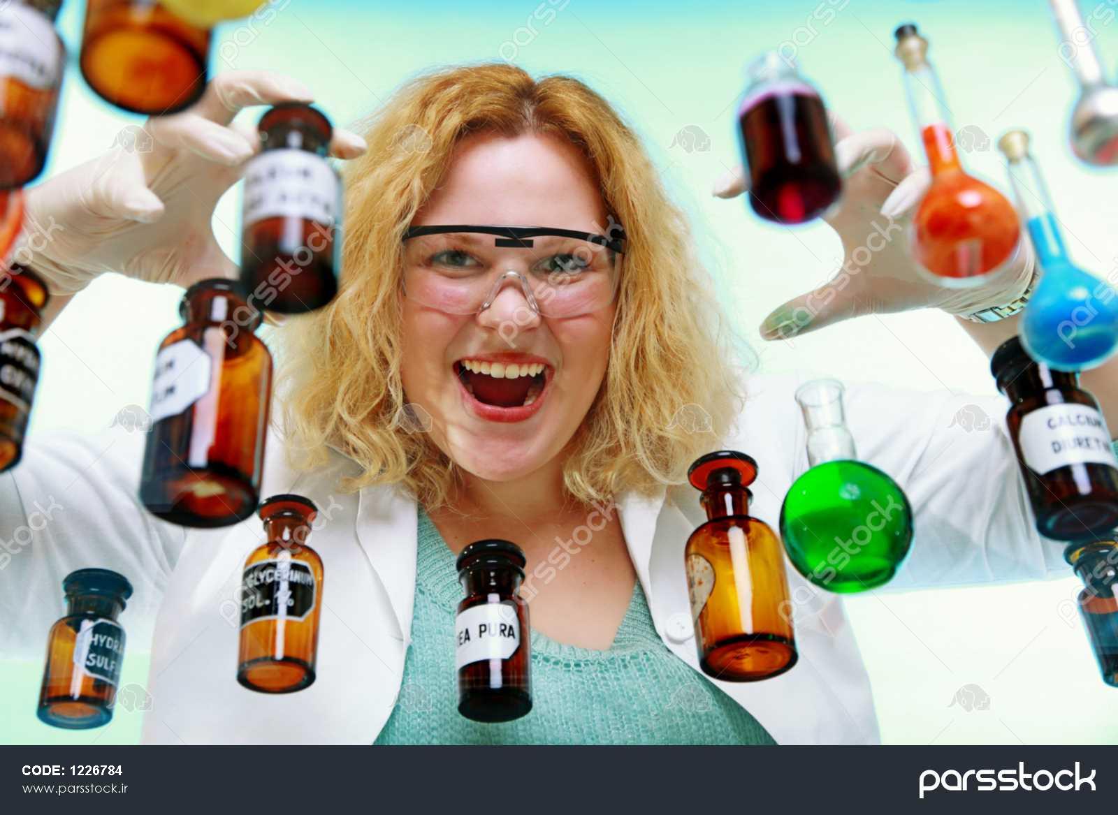 شیمیدان دیوانه زن یا دختر دانشجو یا دستیار آزمایشگاه زن یا محقق علمی با فلاسک آزمایش ظروف شیمیایی آزمایش تحقیق در حال انجام پس زمینه سبز