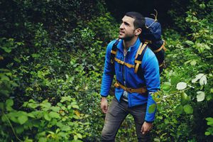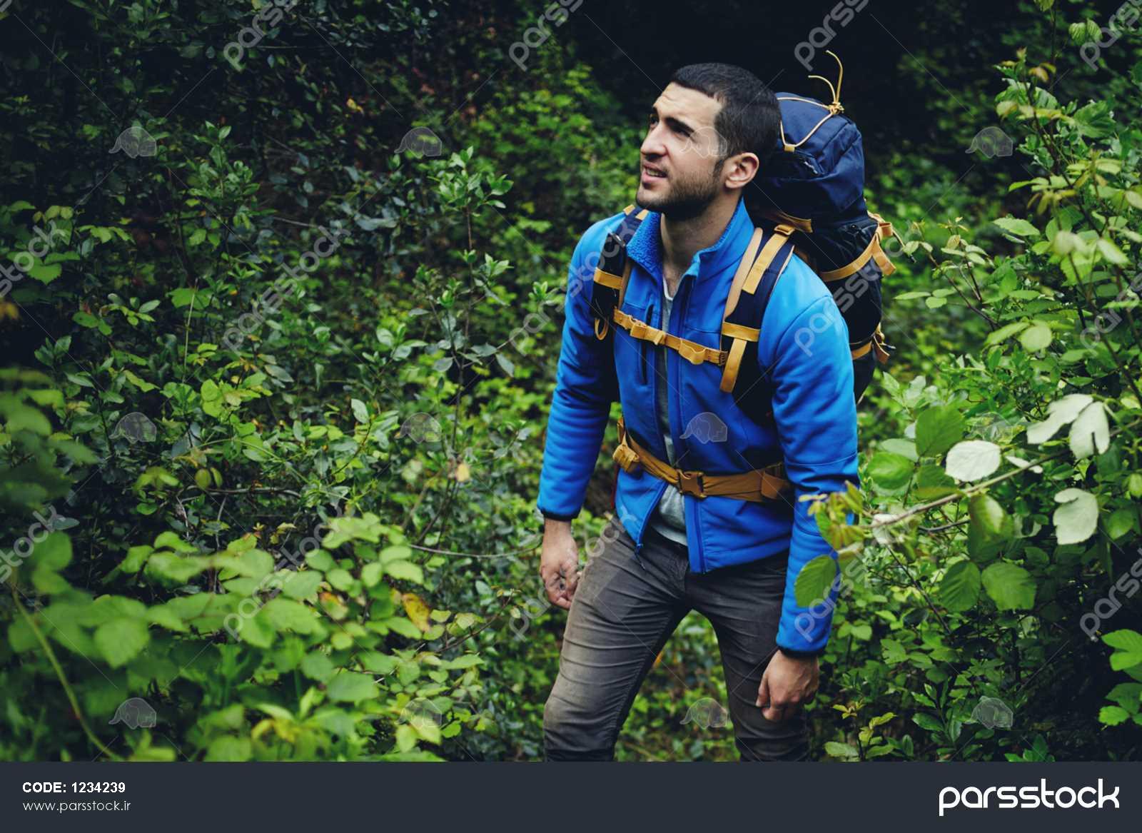 پرتره مرد جوان خوشتیپ با کوله پشتی سرگردان در جنگل در حالی که از منظره طبیعت لذت می برد پیاده روی مرد در حال قدم زدن در جنگل کوه با گیاهان پیاده روی مسافر در کوه در تابستان