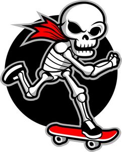 اسکلت کارتونی با روسری سوار اسکیت بورد قرمز اسکیت خود را ردیف کنید