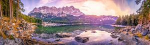 کوه‌های آلپ که در غروب خورشید در دریاچه منعکس شده‌اند - منظره پانوراما با کوه‌های آلپ باواریا که در آب دریاچه eibsee واقع در گریناو آلمان در هنگام غروب آینه شده است