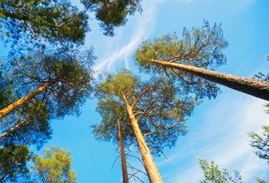درختان کاج بلند در بالای آسمان آبی قرار گرفته اند