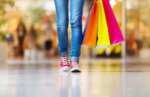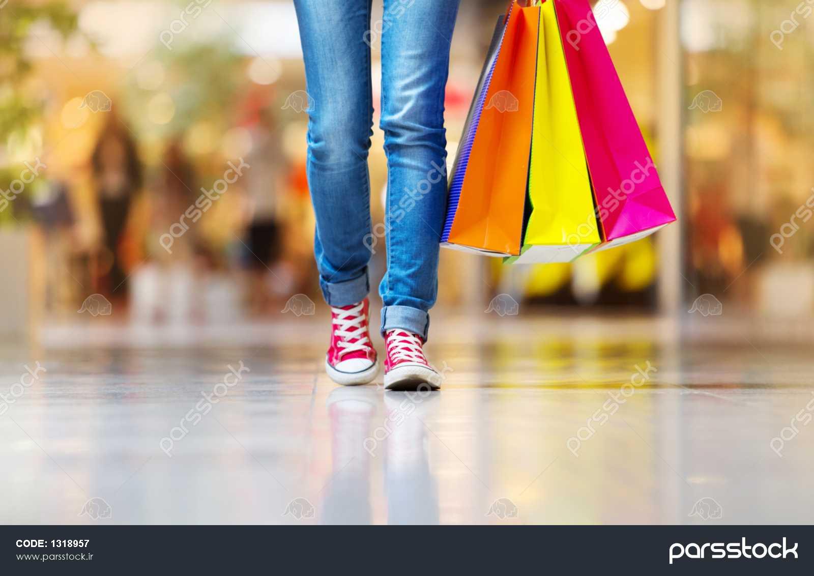زمان خرید دختر نوجوان جوان با کیسه های خرید در مرکز خرید