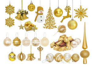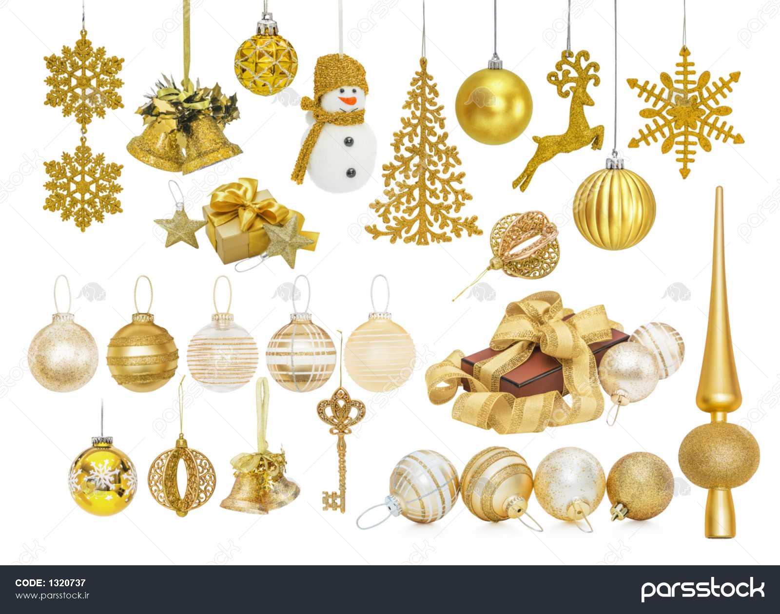 مجموعه ای بزرگ از بابل های طلایی کریسمس برای زیور آلات درخت کریسمس کاج صنوبر توپ دانه های برف زنگ گوزن شمالی آدم برفی هدیه نوک بالا کلید جدا شده روی سفید