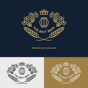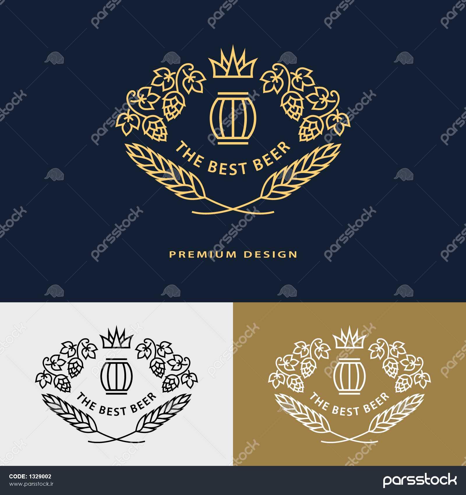 مونوگرام گرافیک خطی قالب تزئینی قاب طراحی لوگو با بشکه رازک مالت برگ برای آرم برچسب نشان برای خانه آبجو بار میخانه شرکت آبجوسازی آبجوسازی میخانه وکتور