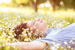 زن جوان زیبا روی یک چمن سبز با گل های سفید در یک پارک دراز کشیده است