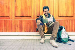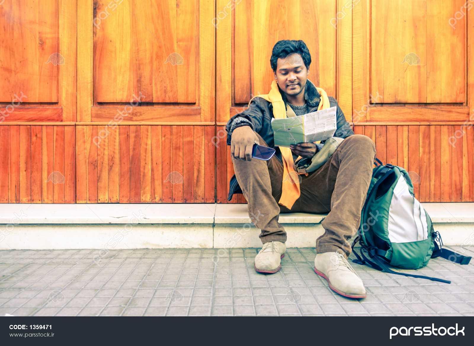 پسر جوان هندی که به نقشه شهر نگاه می کند و تلفن همراه در دست دارد - مرد مدل آسیایی در کنار در چوبی قدیمی - دانش آموز آفریقایی آمریکایی شاد می خواند - مفهوم گردشگری DIY و آزادی - فیلتر کلاسیک نرم
