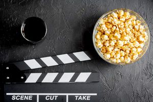 مفهوم تماشای فیلم با پس زمینه تاریک نمای بالا پاپ کورن