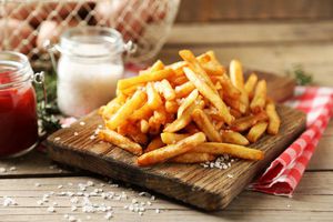سیب زمینی سرخ شده خوشمزه بر روی برش هیئت مدیره روی میز میز چوبی