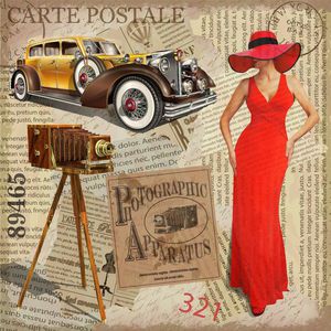 پوستر با عکس با دوربین عریض زن زیبا و ماشین یکپارچهسازی با سیستمعامل پس زمینه روزنامه پاره شده است