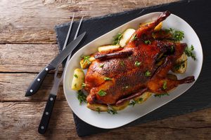 مرغ پخته شده با سیب را در ظرف پخت و پز روی یک میز قرار دهید نمای افقی افقی بریدن اردک کباب از نزدیک روی تخته تخته سنگ افقی اردک کبابی مرغ پخته شده با پوسته طلایی با سبزیجات در زمینه چوبی غذای کریسمس اردک کریسمس اردک کباب کریسمس روی میز جشن سرو می شود اردک کریسمس اردک کریسمس اردک آرد سوخاری خانگی با گیاهان برای تعطیلات مشاهده همه