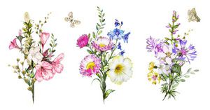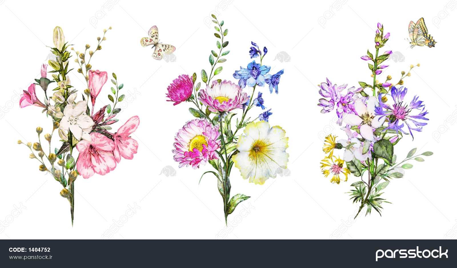 مجموعه آبرنگ گل تصویر گل دسته گل های گیاهی برگ گیاهان ترکیب ناز برای کارت تبریک شاخه گل جدا شده بر روی زمینه سفید با پروانه گیاه شناسی