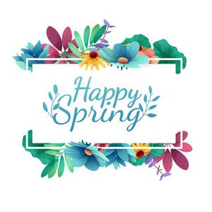 بنر طراحی با آرم Happy Spring کارت برای فصل بهار با قاب و گیاه سفید پیشنهاد تبلیغاتی با گیاهان بهاره برگ و دکوراسیون گل ها بردار