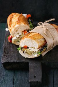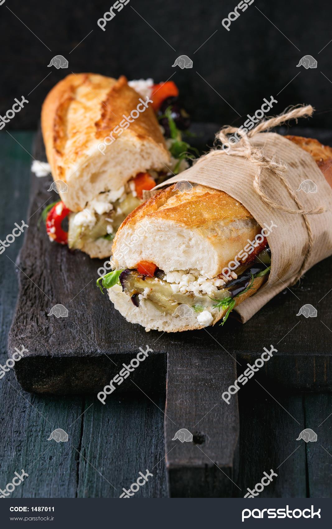 دو نیمی از ساندویچ زیر دریایی باگت گیاهی گیاهی با بادمجان کبابی فلفل و پنیر فتا روی تخته چوبی سیاه روی زمینه چوب تیره
