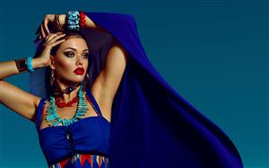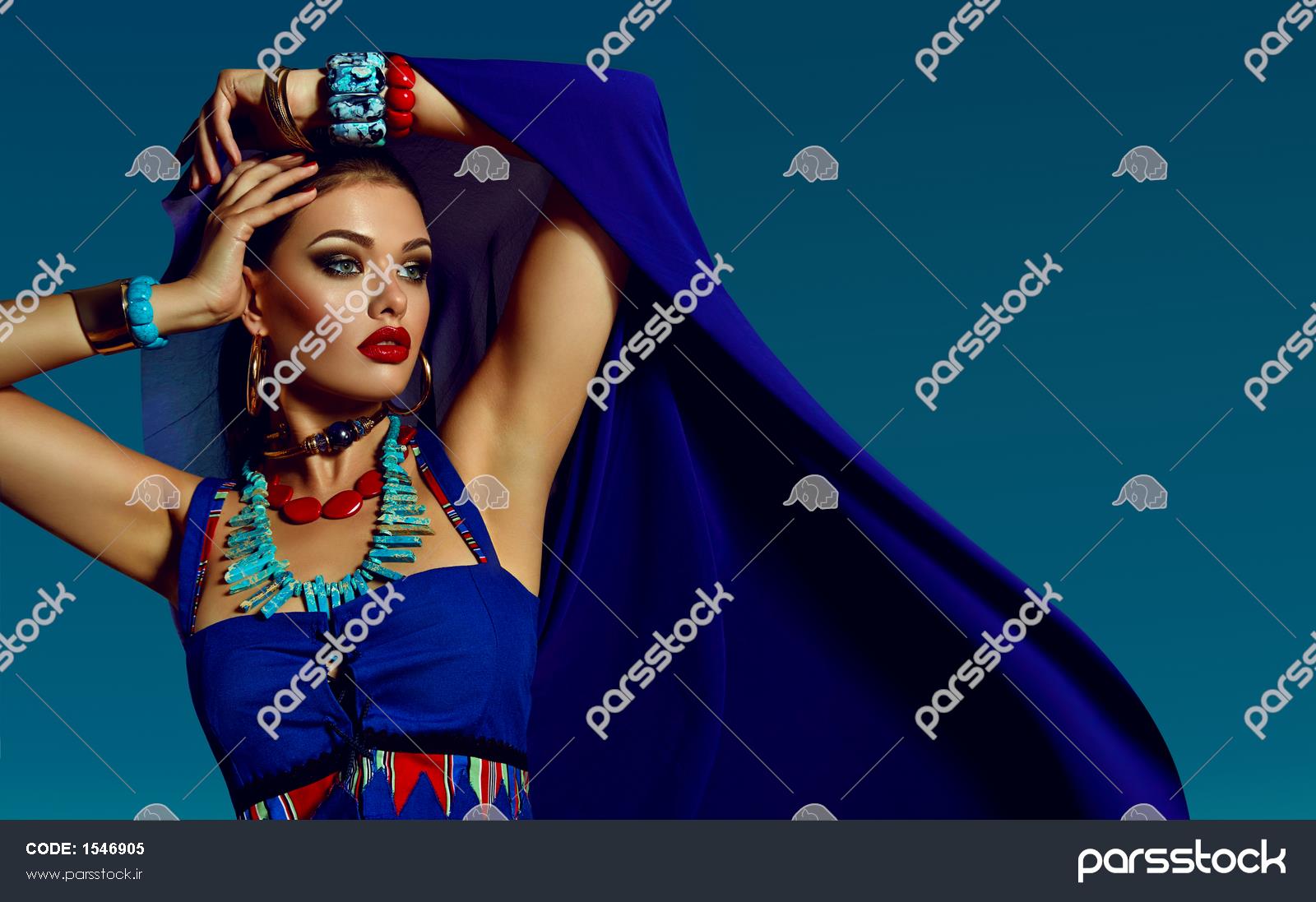 یک دختر جوان زیبا با لباس های آبی روشن و بسیاری از جواهرات در پس زمینه آسمان روشن دستبند گردنبند طلا مد زیبایی آرایش لوازم آرایشی سالن زیبایی سبک مراقبت شخصی