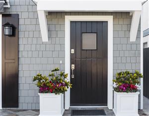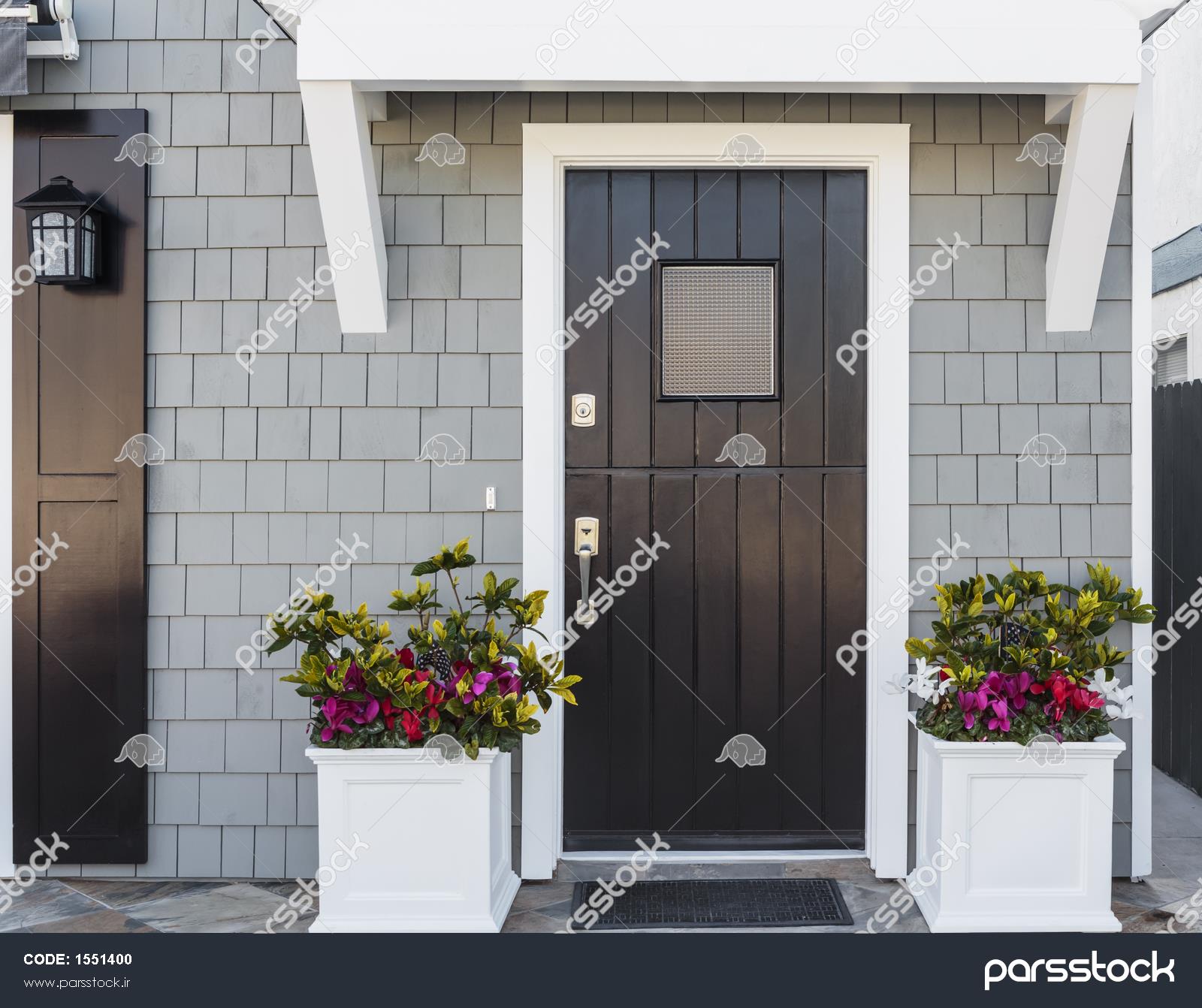 افقی درب ورودی سیاه به یک خانه خانوادگی ؛ درب تخته های چوبی عمودی است دارای یک پنجره توسط دو کاشت زونا خاکستری و حصیر درب قاب گرفته شده است همچنین یک چراغ روشنایی ایوان دیده می شود