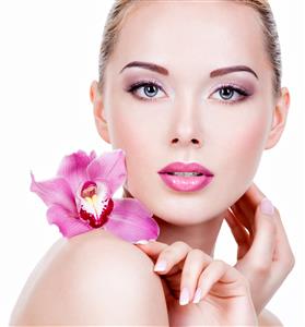 چهره نزدیک یک زن جوان زیبا با آرایش چشم و لب های بنفش دختر بالغ زیبا با گل نزدیک صورت - جدا شده بر روی دیوار سفید