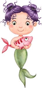 یک پری دریایی کوچک زیبا که ماهی را در دستان خود دارد و با آبرنگ روی زمینه سفید نقاشی شده است