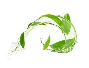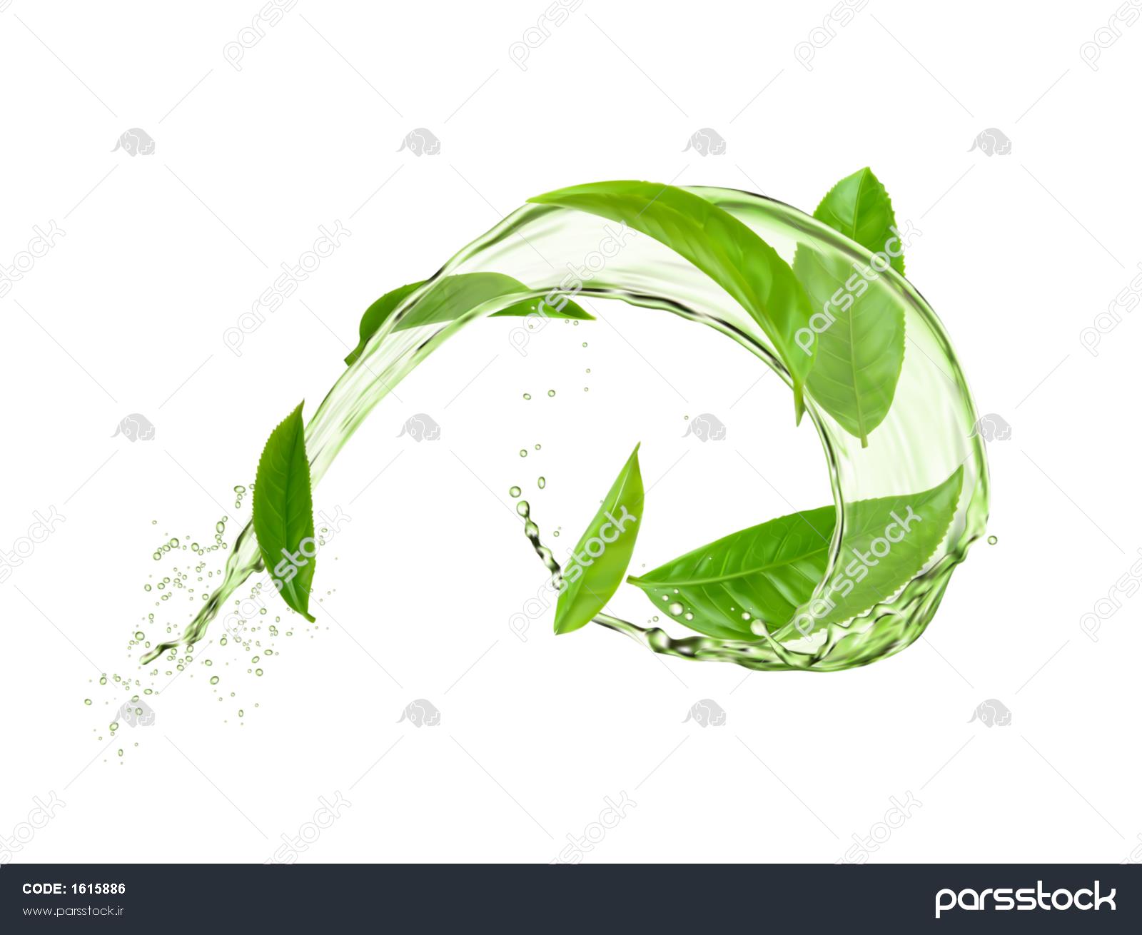 چای گیاهی چرخشی گرد با برگهای سبز و جریان آب وکتور نوشیدنی ارگانیک با اسپلاترها آگهی سه بعدی با ریزش شاخ و برگ واقعی در نوشیدنی عطر طبیعی گیاه تازه آبزی