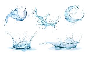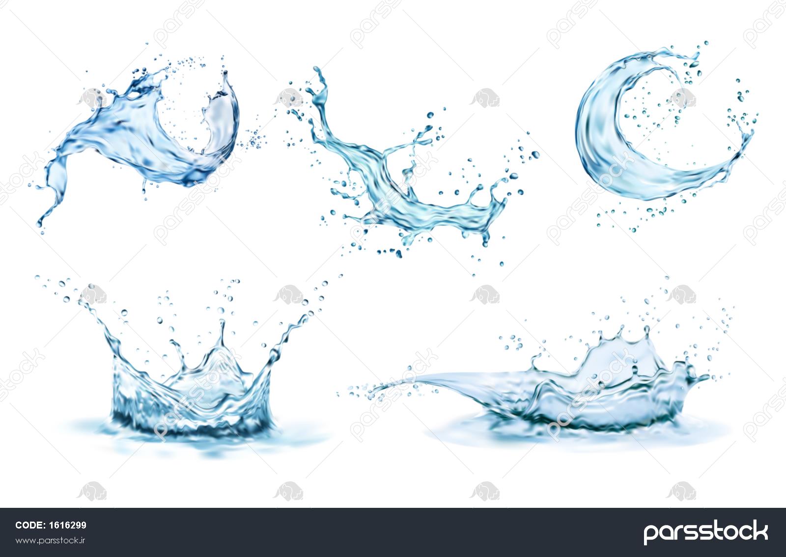 پاشش تاج آب و چرخش موج با قطره وکتور مایع آبی شفاف مایع پاشش مایعات با قطرات جدا شده عناصر سه بعدی واقعی نوشیدنی تازه آبی شفاف در حال سقوط یا ریختن با حباب های هوا