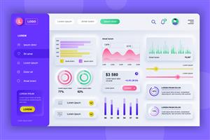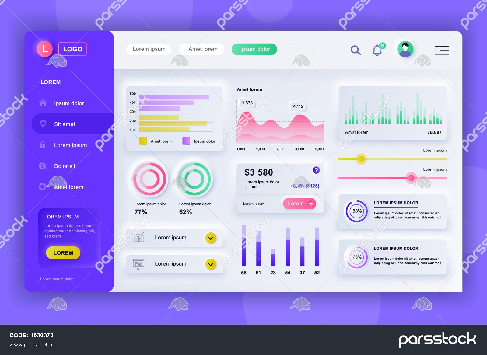 کیت رابط کاربری داشبورد نئومورفیک قالب طراحی وکتور پنل مدیریت با عناصر اینفوگرافیک نمودار HUD گرافیک اطلاعات داشبورد وب سایت برای صفحه وب طراحی UI و UX سبک نئومورفیسم
