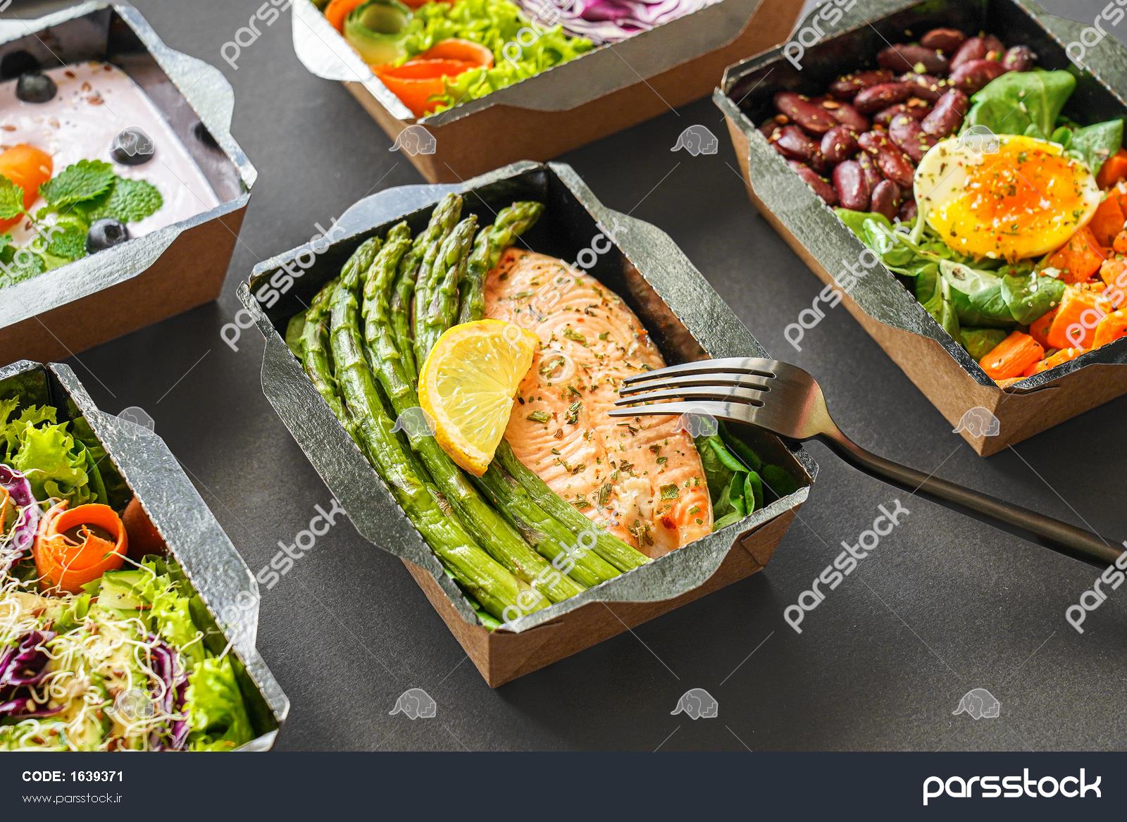 منوی پذیرایی غذای سالم آماده در جعبههای ناهار بستههای ماهی و سبزیجات بهعنوان برنامه رژیم غذایی روزانه تحویل پیک با چنگال جدا شده روی پسزمینه میز مشکی مفهوم سفارش ظروف را وکتورد