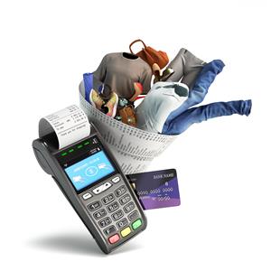 مفهوم سفارش آنلاین لوازم خانگی این تکنیک در یک چک از پایانه کارت پیچیده می شود مفهوم سفارش آنلاین غذا تحویل غذا غذا نزدیک به قرص در یک پس زمینه چوبی 3D تصویر است مفهوم فروش آنلاین املاک خانه در تصاویر 3d تلفن است نمایش همه