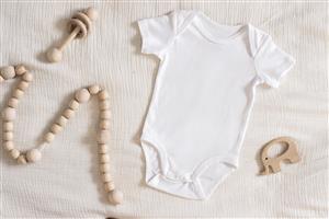 عکس استوک طرح‌دار از Onesie نوزاد سفید شفاف با اسباب‌بازی‌های چوبی کودک نوپا روی دستمال عاج برای ایجاد ماکت برای ارائه طرح تصعید کودکان