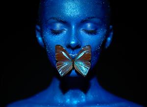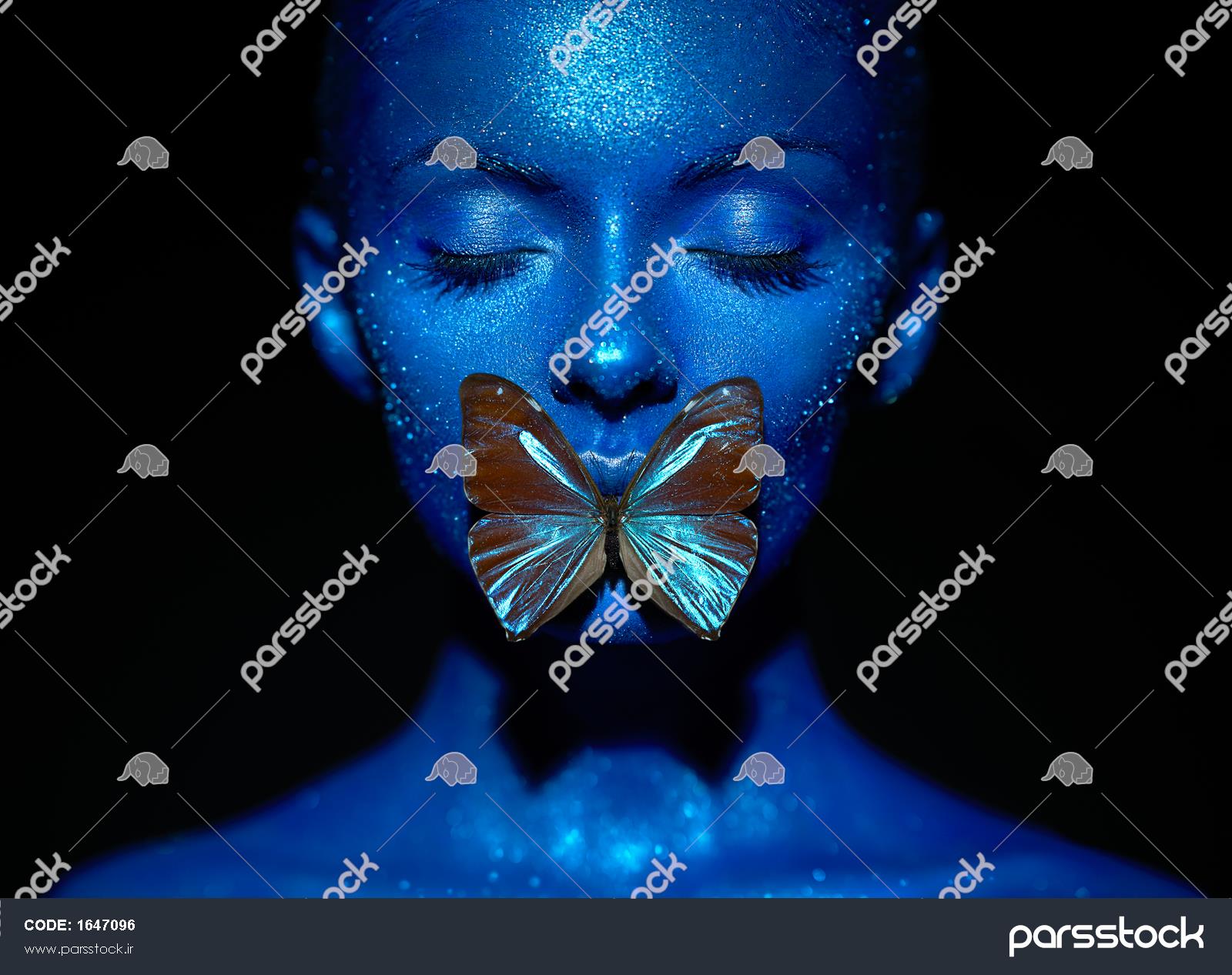 زن مدل مد با درخشش های روشن آبی و چراغ های نئون که در استودیو ژست گرفته است پرتره زن زیبای با پروانه آبی طراحی هنری آرایش براق رنگارنگ