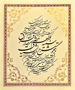 بشنو این نی چون شکایت میکند از جداییها حکایت میکند مولانا خوشنویسی شکسته نستعلیق اثر احسان رسول منش بشنو از نی چون حکایت میکند از جداییها شکایت میکند کز نیستان تا مرا ببریدهاند در نفیرم مرد و زن نالیدهاند سینه خواهم شرحه شرحه از فراق تا بگویم شرح درد اشتیاق من به هر جمعیتی نالان شدم جفت بدحالان و خوشحالان شدم هر کسی از ظن خود شد یار من از درون من نجست اسرار من شعر از مولانا خوشنویسی شکسته نستعلیق اثر احسان رسول منش بشنو از نی چون حکایت میکند از جداییها شکایت میکند کز نیستان تا مرا ببریدهاند در نفیرم مرد و زن نالیدهاند سینه خواهم شرحه شرحه از فراق تا بگویم شرح درد اشتیاق من به هر جمعیتی نالان شدم جفت بدحالان و خوشحالان شدم هر کسی از ظن خود شد یار من از درون من نجست اسرار من شعر از مولانا خوشنویسی شکسته نستعلیق اثر احسان رسول منش این جهان با تو خوش است و آن جهان با تو خوش است این جهان بی من مباش و آن جهان بی من مرو شعر از مولانا خوشنویسی شکسته نستعلیق اثر احسان رسول منش من هیچ ندانم که مرا آنکه سرشت از اهل بهشت کرد یا دوزخ زشت جامی و بتی و بربطی بر لب کشت این هر سه مرا نقد و تو را نسیه بهشت خوشنویسی شکسته نستعلیق اثر احسان رسول منش من هیچ ندانم که مرا آنکه سرشت از اهل بهشت کرد یا دوزخ زشت جامی و بتی و بربطی بر لب کشت این هر سه مرا نقد و تو را نسیه بهشت خوشنویسی شکسته نستعلیق اثر احسان رسول منش من ناگزیر خویشتنم بی ره گریز هرگز کسی مباد چون من مبتلای خود خوشنویسی شکسته نستعلیق شعر از حسین منزوی اثر احسان رسول منش من اختیار خود را تسلیم عشق کردم خوشنویسی شکسته نستعلیق اثر احسان رسول منش اندر دل من درون و بیرون همه اوست مولانا خوشنویسی شکسته نستعلیق اثر احسان رسول منش خوش آن زمان که نکویان کنند غارت شهر مرا تو گیری و گویی که این اسیر من است شهیدی قمی خوشنویسی شکسته نستعلیق اثر احسان رسول منش نمایش همه