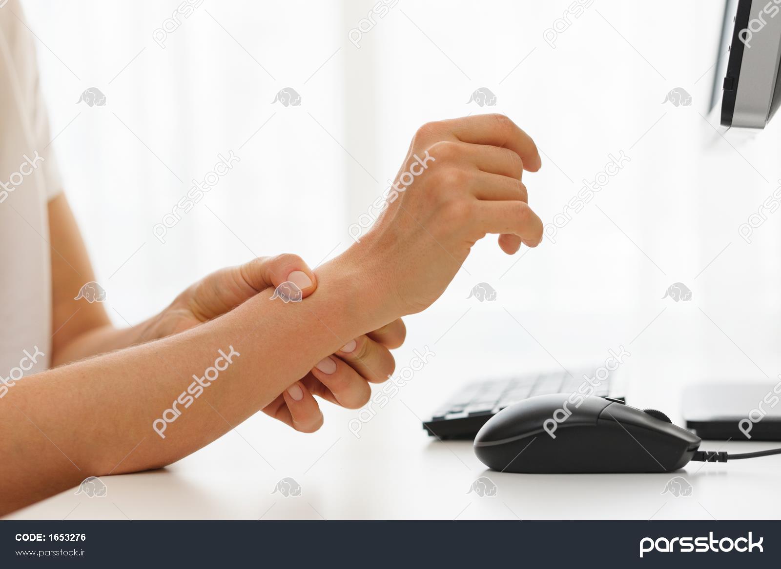 نمای نزدیک از دست های زن با درد مچ دست به دلیل سندرم تونل کارپ
