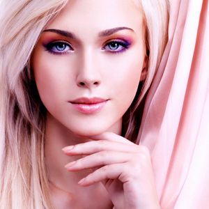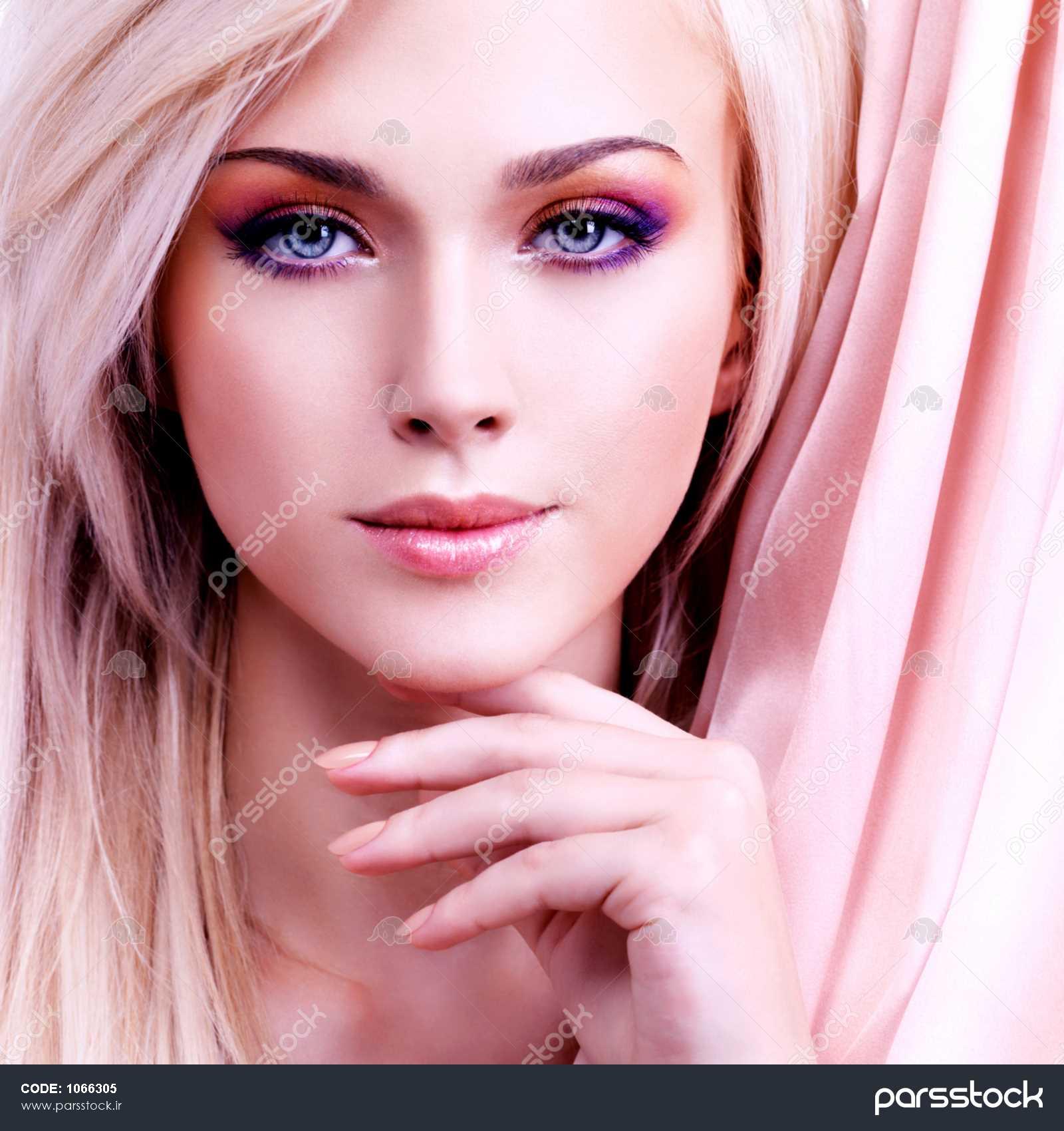 زن زیبا با ابریشم صورتی که صورتش را جدا شده روی سفید لمس می کند