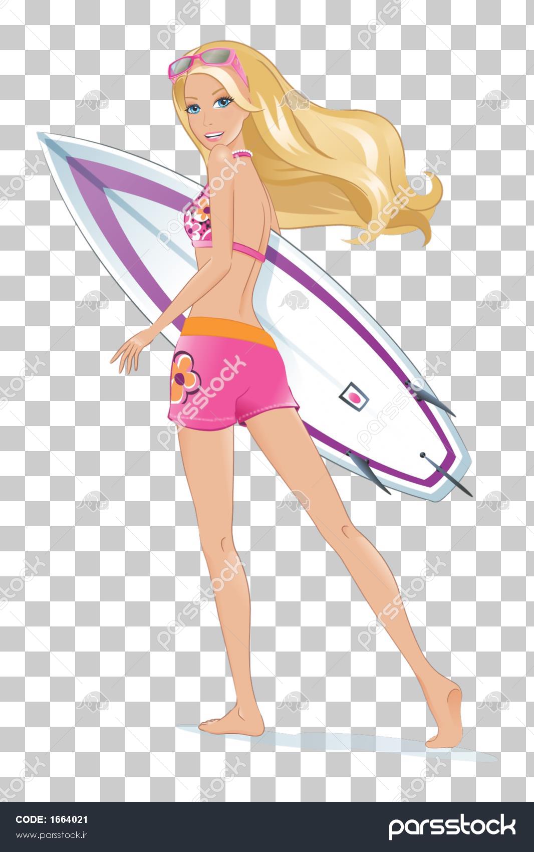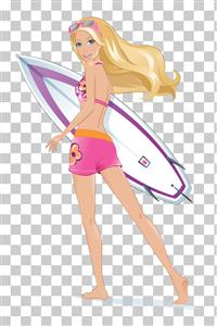 نقاشی باربی با لباس شنا صورتی و تخته موج سواری