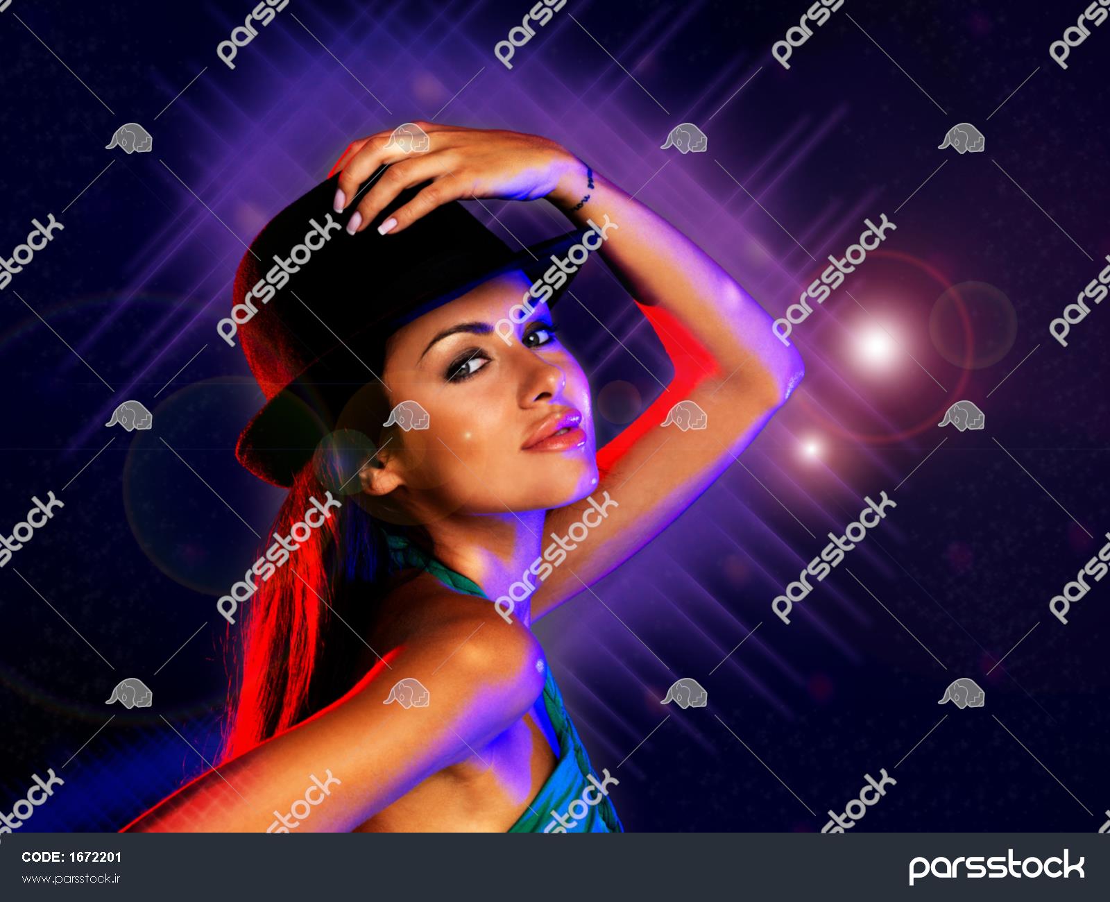 رویداد دیسکو زن رقصنده تکنو دی جی در حال معاشقه در جشن سال جدید و تبلیغ موسیقی کلوپ شبانه کلاه جشن رقص دختر زیبای جذاب و پسزمینه روشن زندگی شبانه رنگارنگ