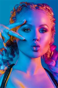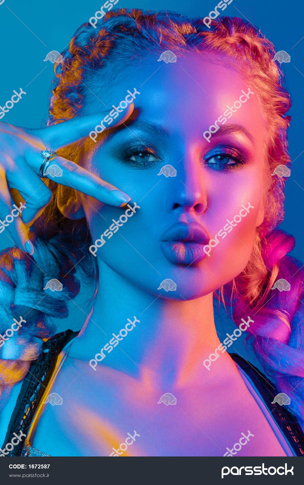 پرتره مد زن بلوند جوان و خیره کننده با بافته های مد روز و سوتین درخشان زیر بالای توری که او علامت صلح را در کنار چشم نگه داشته و لب های ژولیده را در نور آبی و قرمز روشن می گیرد