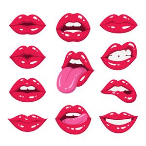 مجموعه لب های قرمز تصویر برداری از لب های یک زن که بیانگر احساسات مختلف است مانند لبخند بوسه دهان نیمه باز لب گاز گرفتن لیسیدن لب زبان بیرون جدا شده روی سفید