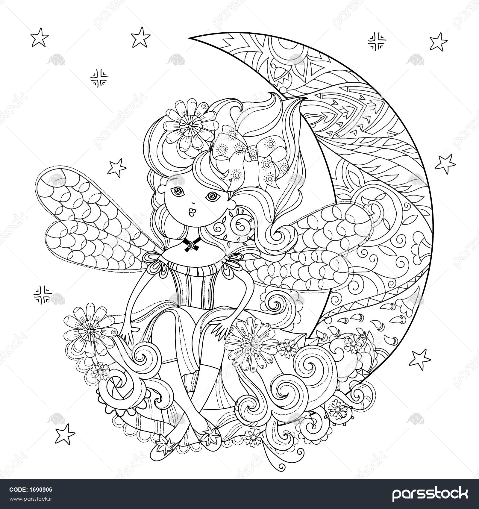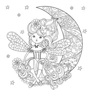 وکتور دختر پری ناز با گل در نیمه ماه کریسمس تصویر وکتور خط طرحی برای کارت پستال یا چاپ یا رنگ آمیزی کتاب ضد استرس بزرگسالان ابله به سبک هنری بوهو ذن