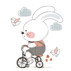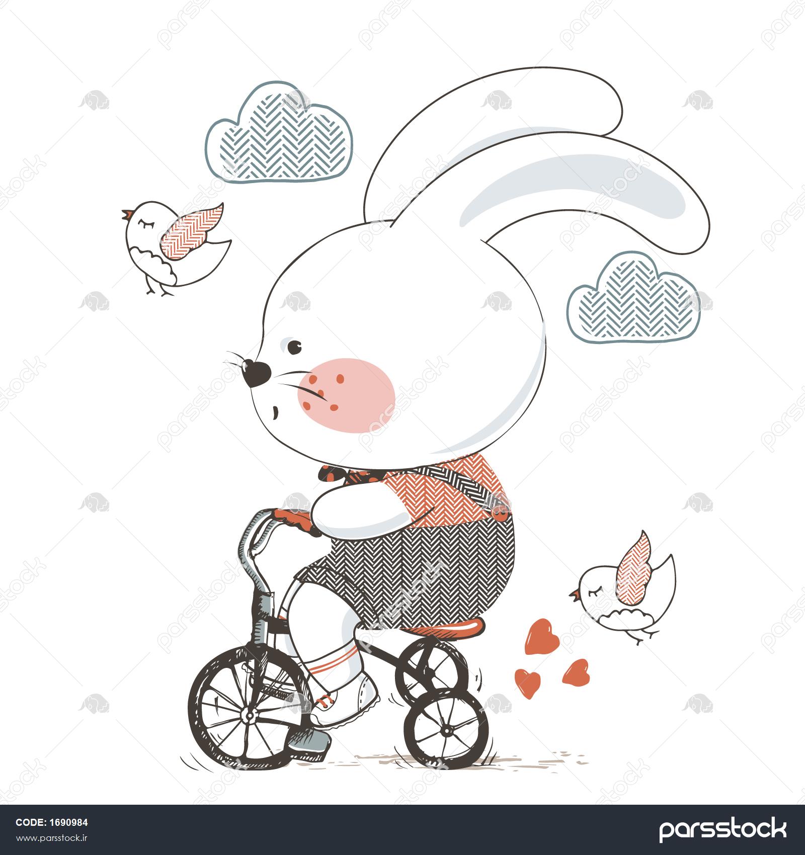 خرگوش تصویر برداری با دست از اسم حیوان دست اموز دوچرخه سواری سه چرخه قابل استفاده برای طراحی پیراهن کودک یا نوزاد طراحی چاپ مد مد گرافیک تی شرت پوشیدن لباس کودکان