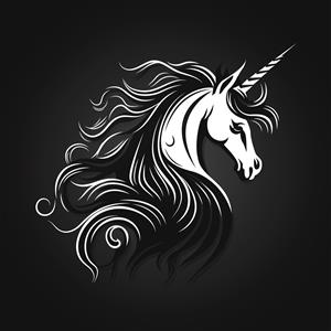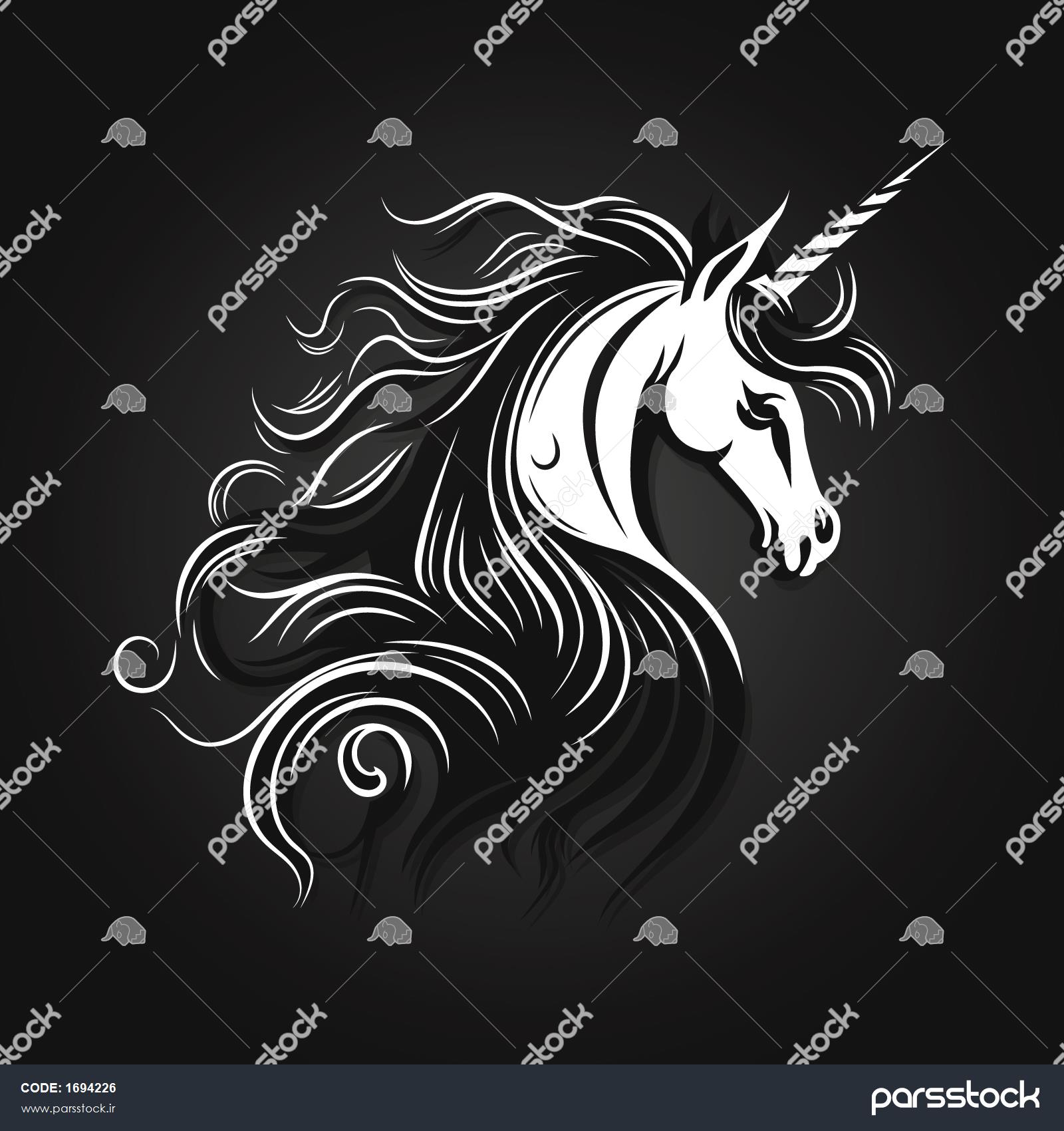 سر وکتور تکشاخ تصویر سیاه و سفید یک اسب شاخدار وحشی جدا شده در پس زمینه تیره برای دکوراسیون چاپ طراحی لوگو باشگاه ورزشی خالکوبی طراحی تی شرت برچسب فایل وکتور