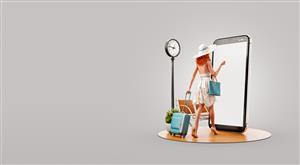 زن جوان با لباس تابستانی با چمدان سفر به صفحه گوشی هوشمند و با استفاده از برنامه تلفن هوشمند می رود مفهوم برنامه های سفر گوشی های هوشمند تصویر سه بعدی غیرمعمول