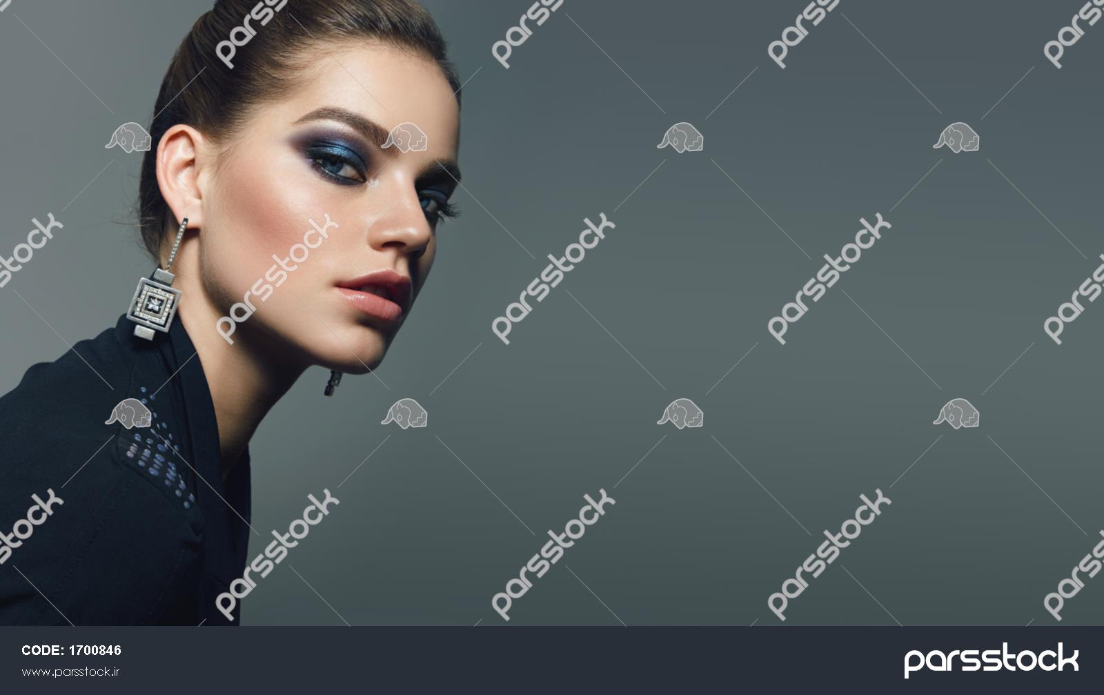 نمای نزدیک زنان جوان سفیدپوست با ژاکت مشکی روی پس‌زمینه خاکستری در استودیو آرایش - اسموکی آبی سایه های فلزی رژ لب براق درخشان مدل مو - موهای صاف شانه شده