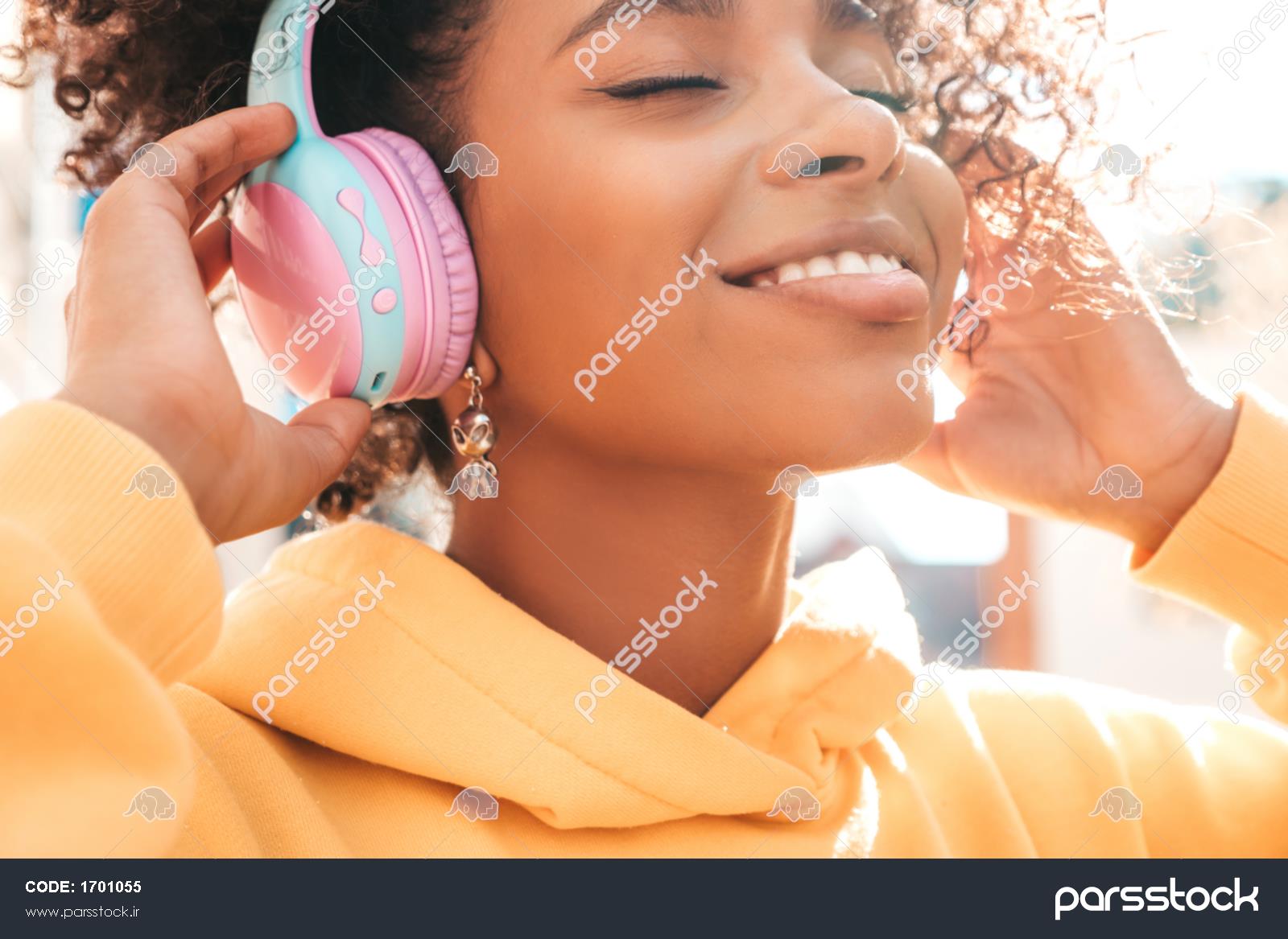 زن سیاهپوست زیبا با مدل موی فرهای آفرو مدل خندان با هودی زرد زن بی خیال در حال لذت بردن از گوش دادن به موسیقی با هدفون بی سیم ژست گرفتن در پس زمینه خیابان هنگام غروب آفتاب چشمان بسته