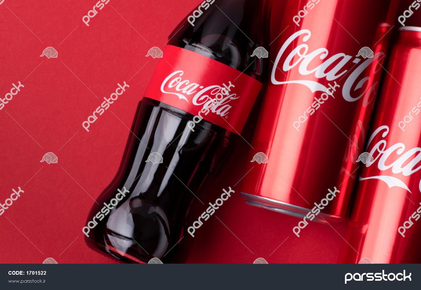 کیف اوکراین - 14 فوریه 2021 یک بطری و دو قوطی کوکاکولا روی پس‌زمینه قرمز قرار گرفته‌اند