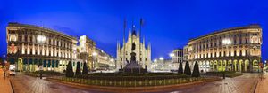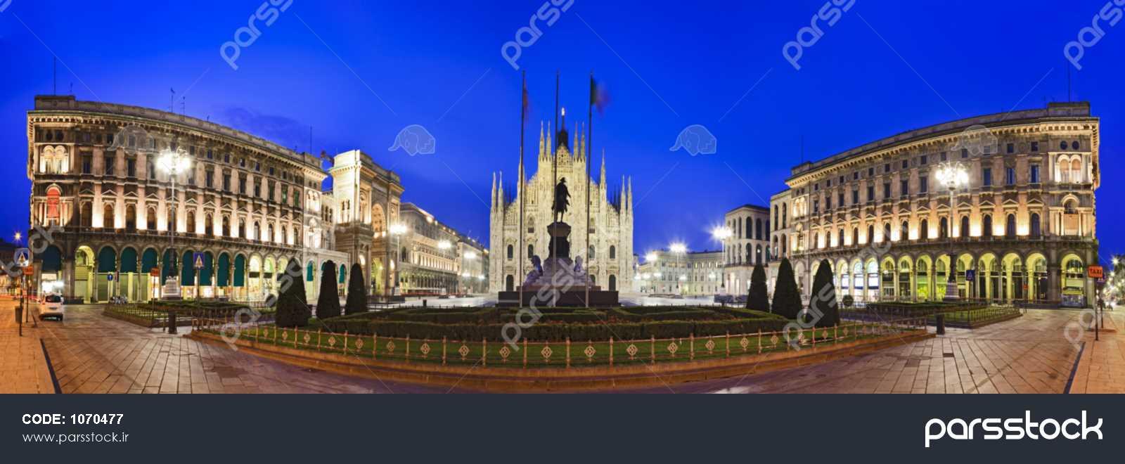 ایتالیا میدان مرکزی میلان نمای پانوراما از انتها تا انتها با کلیسای جامع در نمای میانی و بال‌های ساختمان‌های باروک منظره شهری در طلوع خورشید زیر آسمان آبی با چراغ‌های روشن