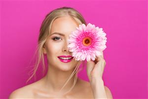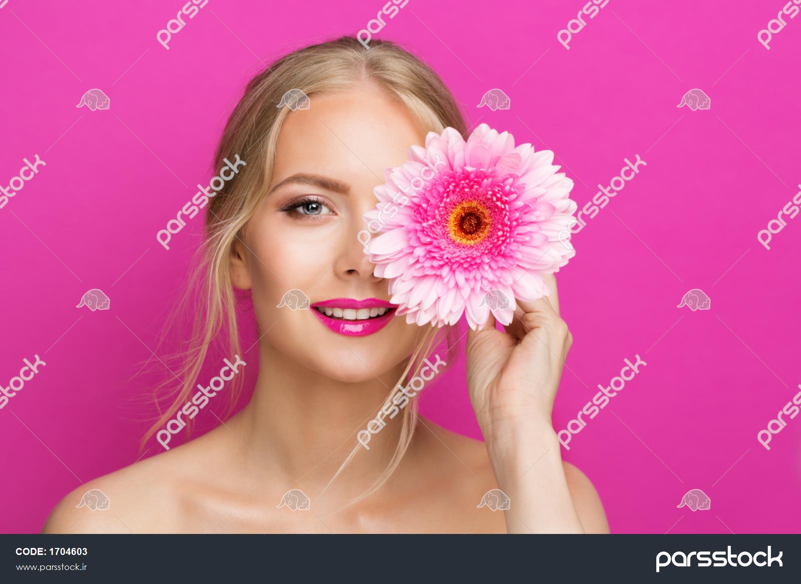 مدل با رژ لب صورتی زن جوان با آرایش لب های تابستانی پوشش چشم دختر مد با گل روی پس زمینه بنفش لوازم آرایشی زنانه و مراقبت از پوست صورت